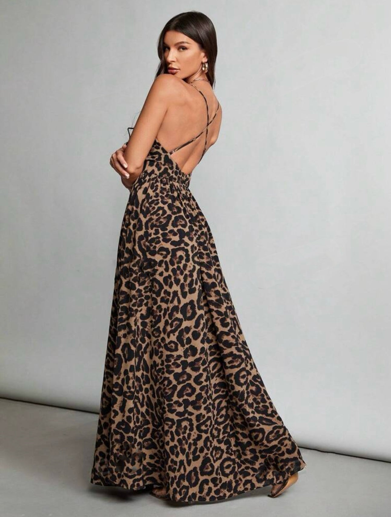 Vestido largo estampado animal con apertura en pierna y escote espalda